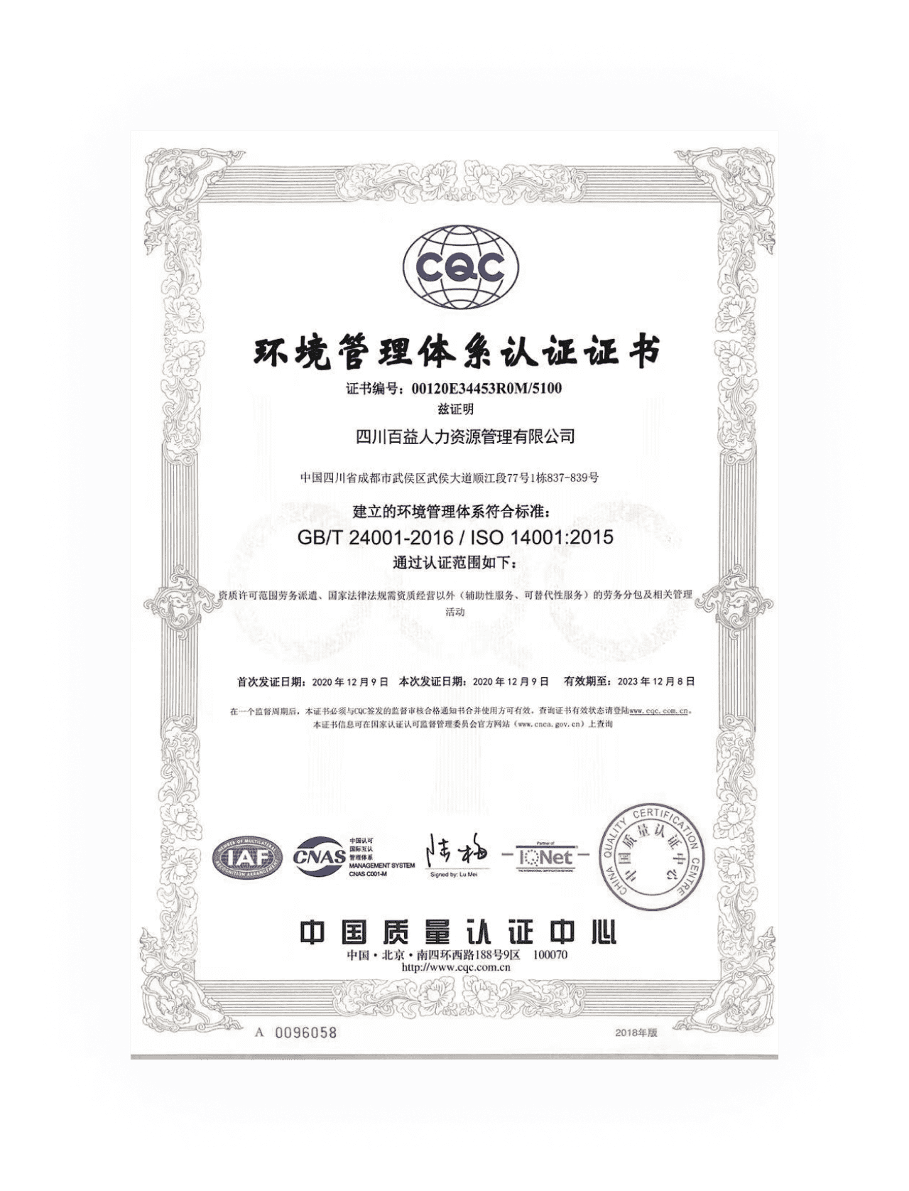 环境管理体系认证证书