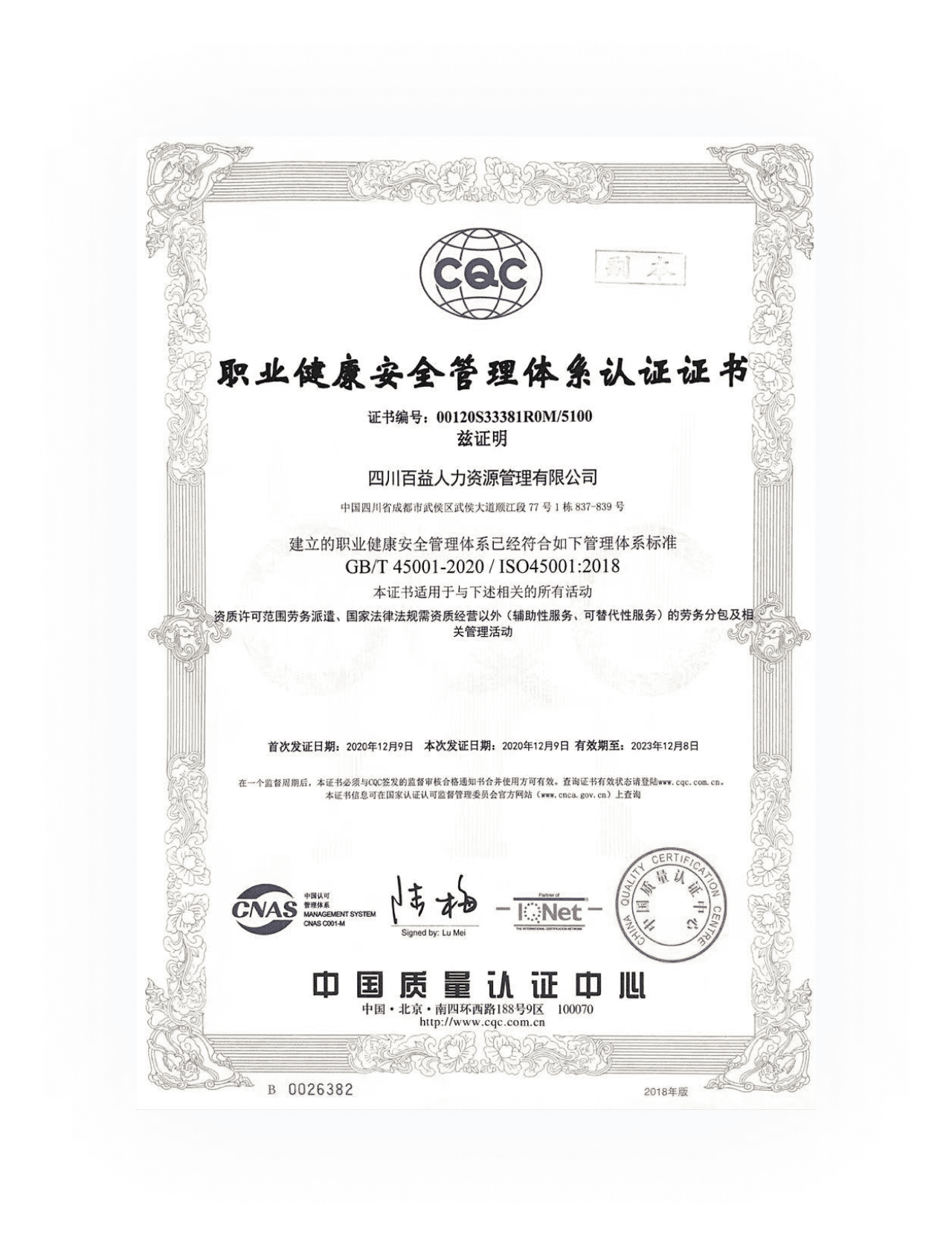 职业健康安全管理体系认证证书