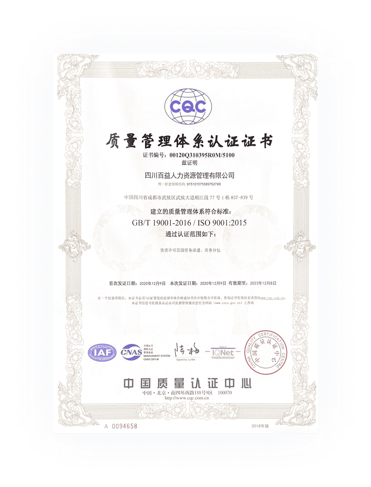 质量管理体系认证证书